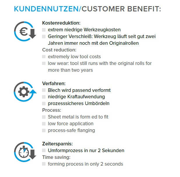 <A forming process with a flanging tool from Baublies suitably deforms the shee tmetal and fixes the machined parts: The sheet metal cap, which is flanged in two seconds, makes the design food-safe and dishwasher-safe.